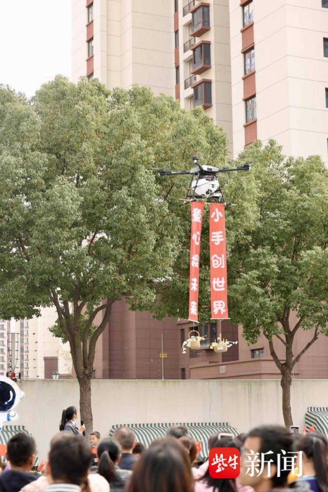 在园长的祝福中,科技节正式拉开帷幕!无人机承载着梦想翱翔,将“童心探未来 小手创世界”的主题字幅带到开幕式现场,孩子们一片欢呼。