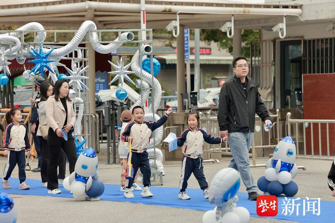 记者走近幼儿园,园内浓厚的科创氛围扑面而来,一条“星空蓝”地毯铺陈开来,宛如一条通往未来的科幻隧道。大班的“小小探索家”早就翘首以盼,他们兴奋地拉着爸爸妈妈的手共同开启这场科学探秘之旅。